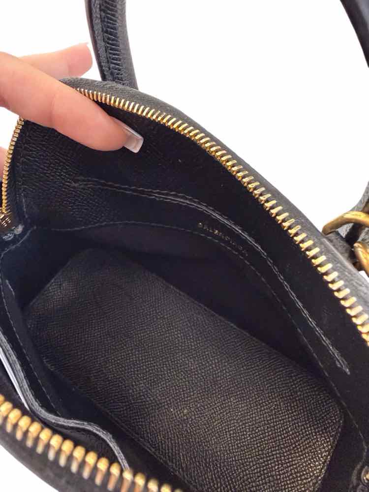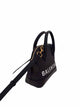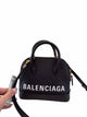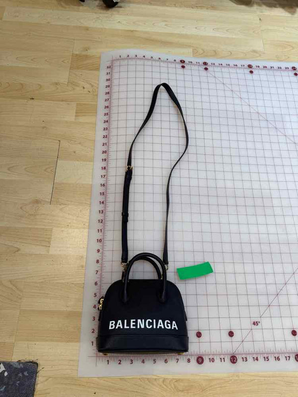 Small handbag, balenciaga logo in front in white, top handle bag, black throughout, shoulder strap as well, w/ dustbag