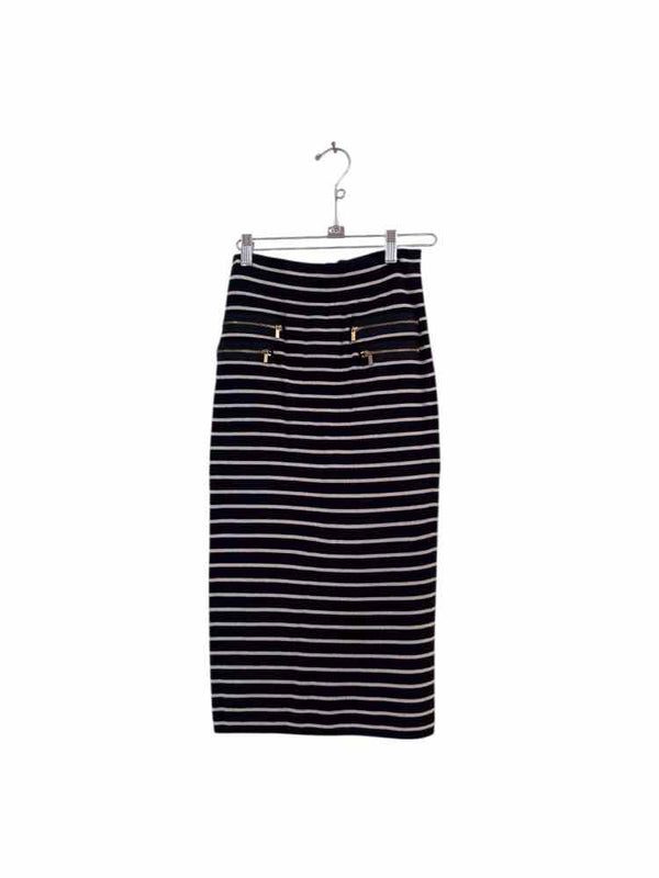 The navy blue and white stripes of the Cache Navy and White Size S Skirt add a refreshing nautical flair to any women's consignment fashion collection. This pre-loved designer piece, available through authentic luxury resale, features a chic midi length and is accented by four front zippers with gold hardware for a touch of polish. Designed by Cache and curated in very good condition, this skirt offers a unique blend of style and versatility that easily complements your favorite tops and accessories. Discover an exceptional addition to your wardrobe from our curated selection of pre-owned finds.