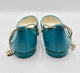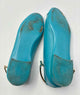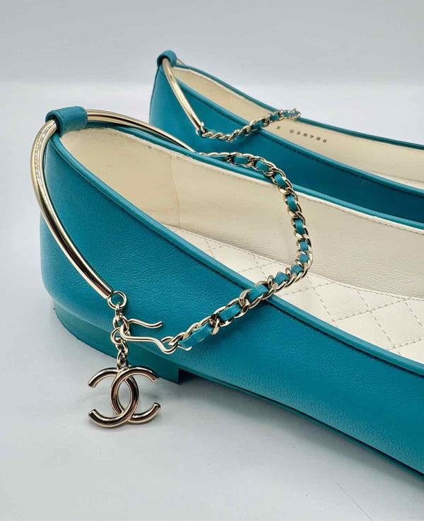 Closed round toe,aqua leather ballerina flats,patent leather toe caps,metal ankle strap closures,leather intertwined chain with chanel charm and flower charm,clasp closure,quilted soles