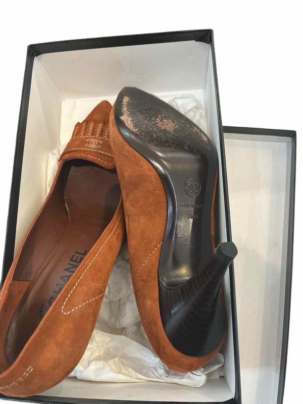 Crafted from rich suede, these Chanel Burnt Orange Size 39.5 Shoes offer a distinctive touch to any women's consignment fashion collection. The solid burnt orange hue is beautifully complemented by white stitching accents, while a subtle fringe detail at the front adds unique texture and interest. With a classic pump silhouette and a comfortable 3-inch heel, this pre-loved designer pair arrives in its original box and is rated in very good condition. Experience authentic luxury resale with a shoe that combines Chanel’s attention to detail with refined color and craftsmanship.