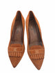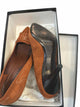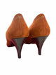 solid burnt orange, pumps, slight fringe design in front, suede material, white stitching accents, 3 inch heel, w/box