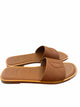 open toe, slip on sandals/ flats, 2 shades of brown, red soles, symbol on front of shoe,