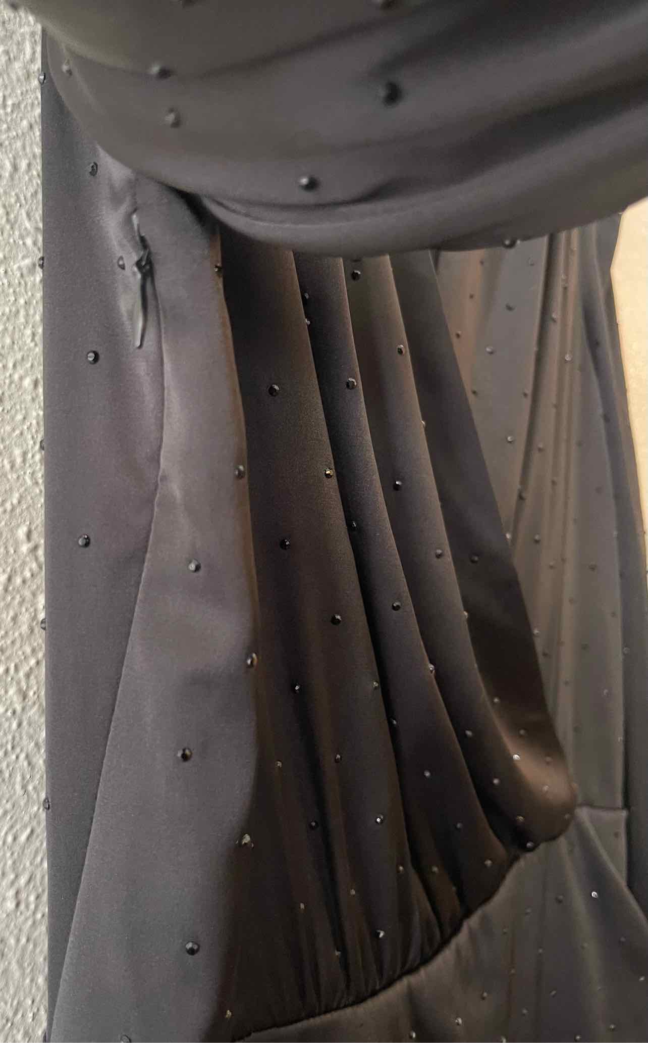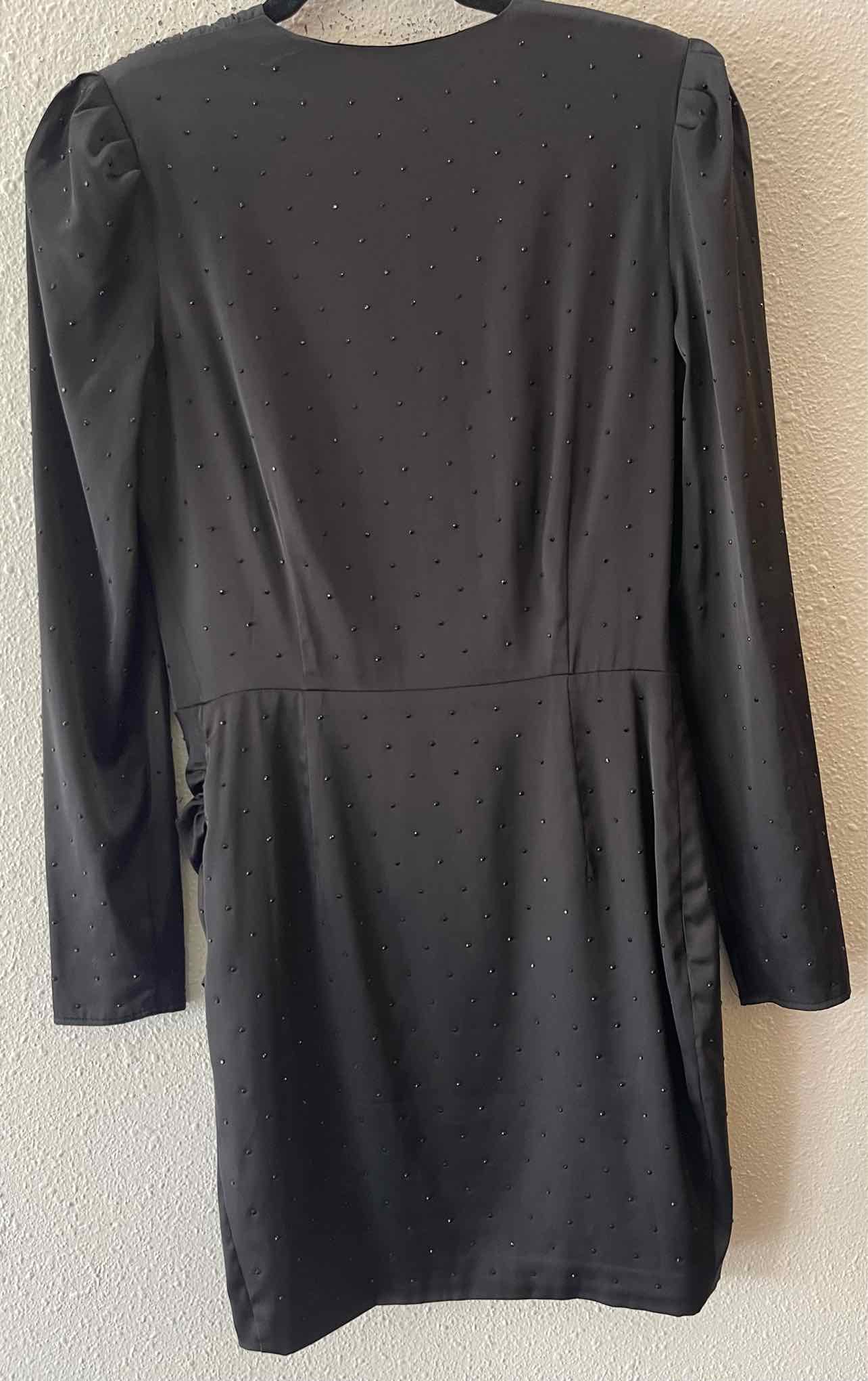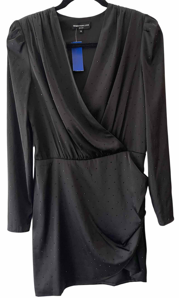 The color and crystal detailing of this Generation Love Black Size XS Dress bring a touch of glamour to authentic luxury resale. This pre-loved designer mini dress features a solid black satin fabric adorned with black crystals throughout, creating a remarkable effect for any occasion. Its deep v cut out, long sleeves, and gather-ruched side with a flap-over slit add a unique flair to women's consignment fashion. With a hidden side zip closure and "rafael crystal" embellishments, this dress combines tailored elegance with chic, modern design—all in very good condition for its next owner.