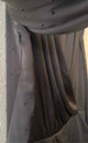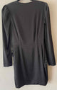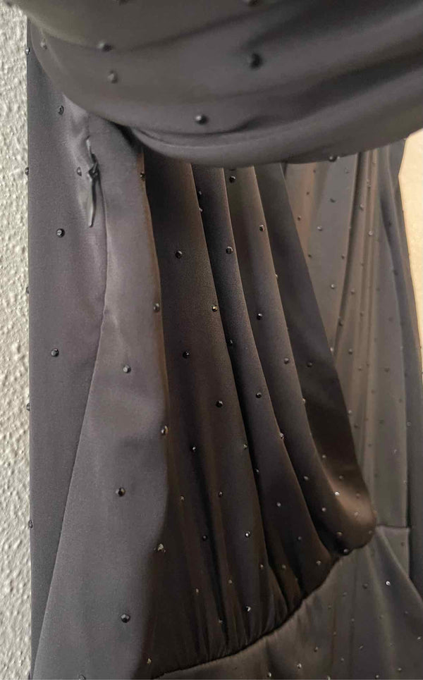 long sleeves,deep v cut out,solid black,"rafael crystal",satin mini dress,black crystals through out,gather ruched at side,flap over slit,hidden side zip closure
