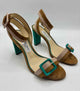 pa*minor wear,w/box,thick heel,open toe,tan suede sandal heel,tan and cream at toe,emerald stitched buckle,tan and cream strap at ankle with buckle closure,emerald color at heel