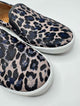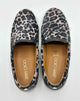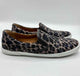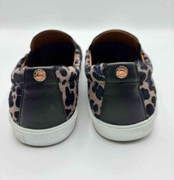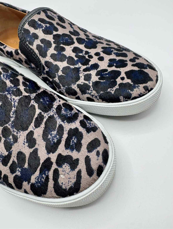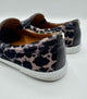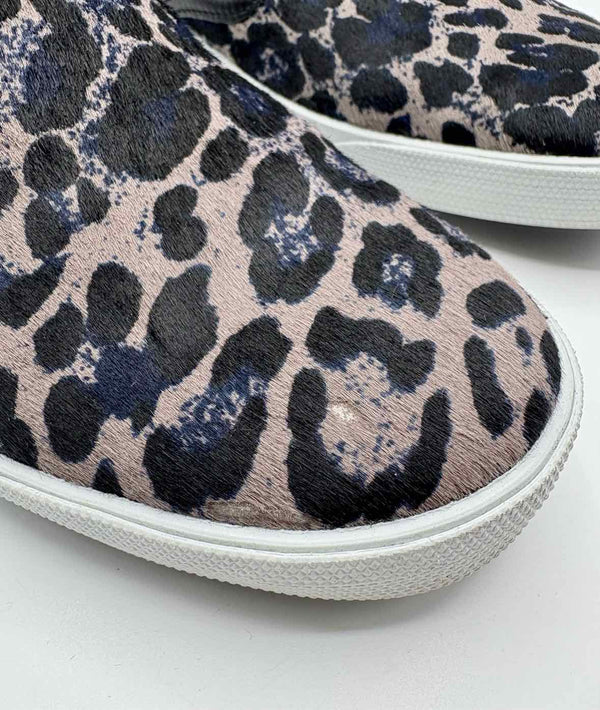 *pa for minor wear,closed round toe,taupe calf hair leather trim slides,black and navy leopard spot design,white rubber sole