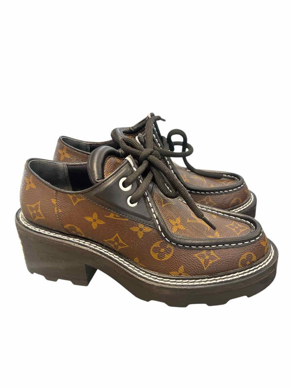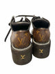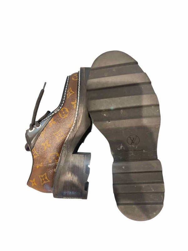 The color-blocked design of these Louis Vuitton black and brown Size 37.5 Shoes brings classic style to the forefront of women's consignment fashion. Featuring the iconic monogram throughout and a bold black platform, this pre-loved designer pair offers a distinctive look for authentic luxury resale enthusiasts. The original box is included, and the shoes are in excellent condition, making them a remarkable option for those seeking curated, high-end selections in size 37.5. Crafted for those who appreciate both brand heritage and modern flair, these authentic Louis Vuitton derbies complement any collection with their eye-catching details.