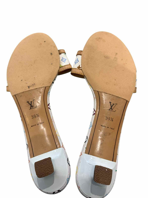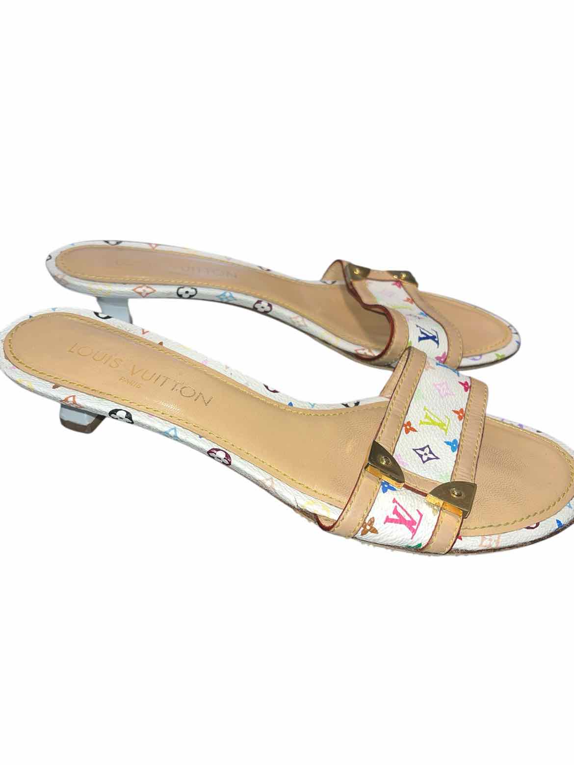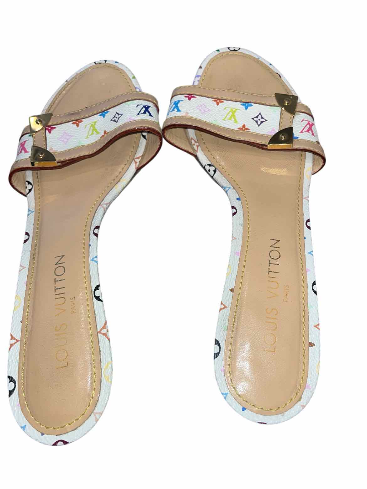 The color and pattern of these Louis Vuitton White Multi Size 39.5 Shoes add a vibrant twist to timeless design, making them an exceptional find in authentic luxury resale. The classic Monogram Multicolor motif, paired with gold hardware and a chic open-toe silhouette, reflects the refined artistry of Louis Vuitton. As a pre-loved designer piece offered through women's consignment fashion, this pair showcases both elegance and versatility. With a comfortable tan insole and slip-on style, these sandals are curated in good condition, making them a distinctive addition for anyone seeking notable luxury at a smart value.