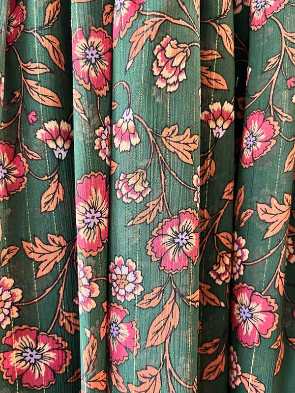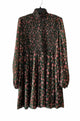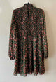 Long sleeve,smocked high neck,forest green fit and flare mini dress,multicolored floral design throughout,muted orange,dark pink,cream,lavender,black,subtle gold metallic tinsel,smocked bust,sheer balloon sleeves,back keyhole button closure