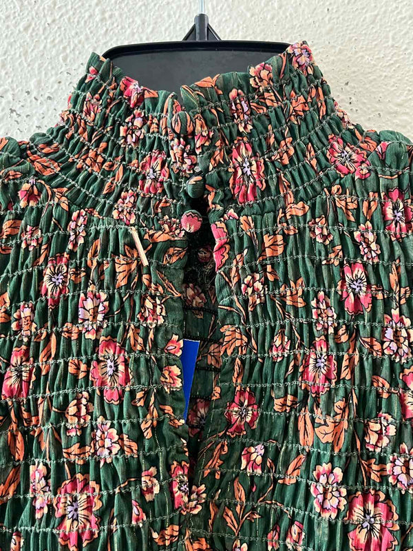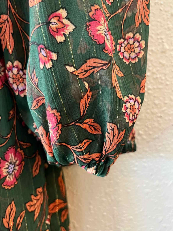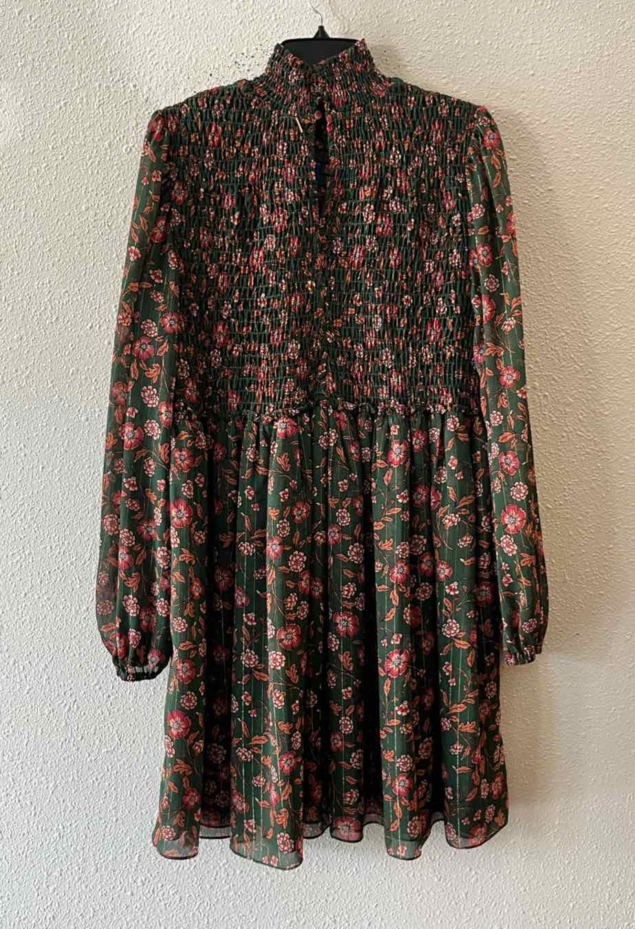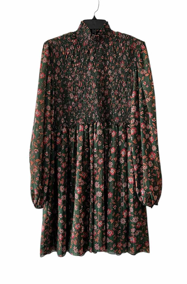 The color-rich pattern of the Misa Forest Green Multi Size L Dress brings a fresh perspective to authentic luxury resale and women's consignment fashion. This pre-loved designer mini dress features a vibrant mix of muted orange, dark pink, cream, lavender, black, and subtle gold metallic tinsel, all set against a striking forest green backdrop. The smocked high neck and bust, along with sheer balloon sleeves and a flared silhouette, provide a refined take on classic femininity. Carefully maintained in excellent condition, this piece is a remarkable addition for those seeking unique, curated style from trusted brands.