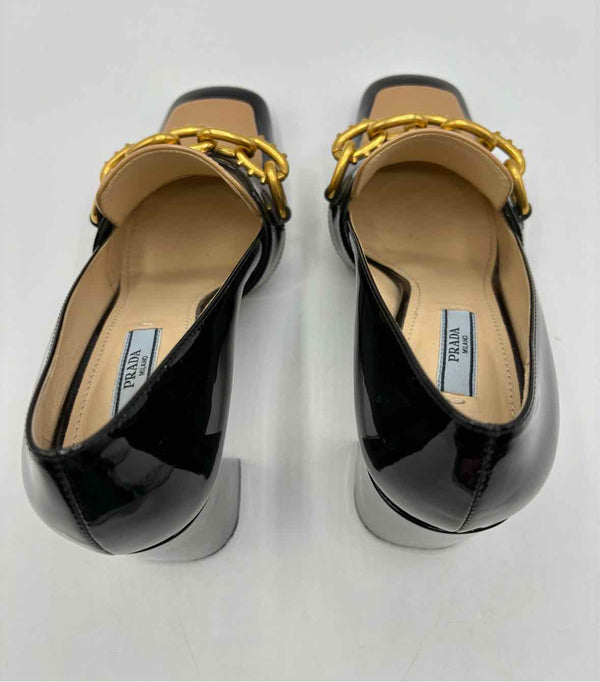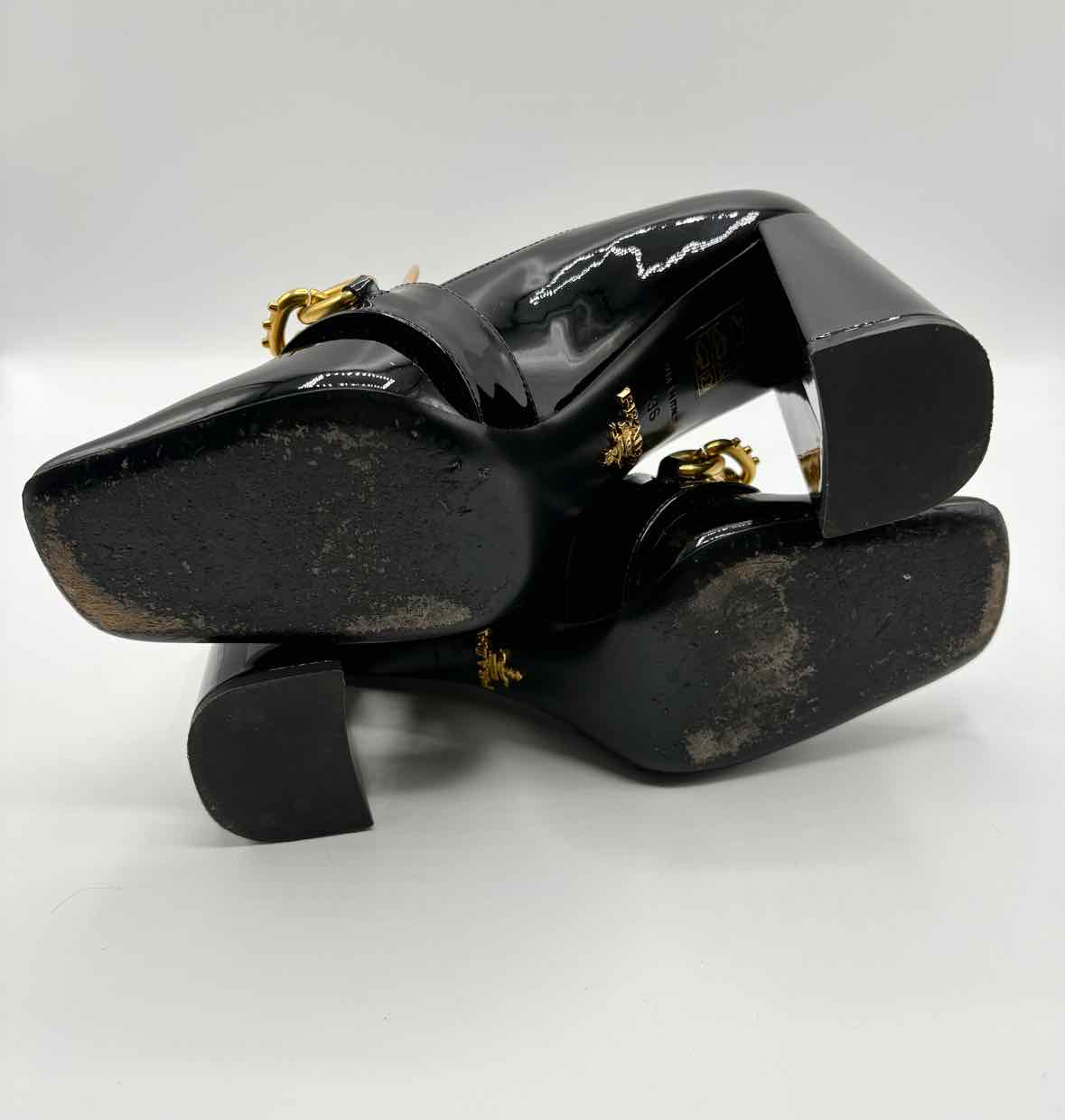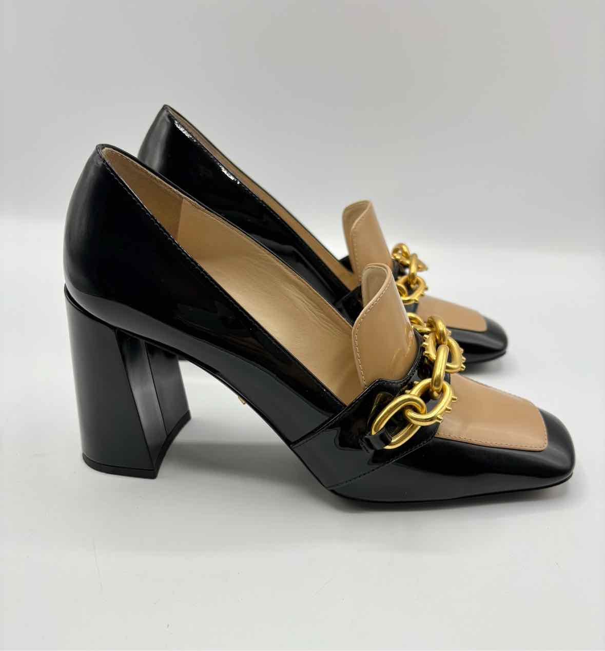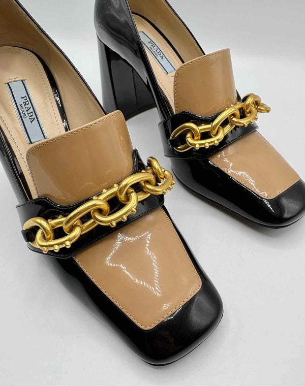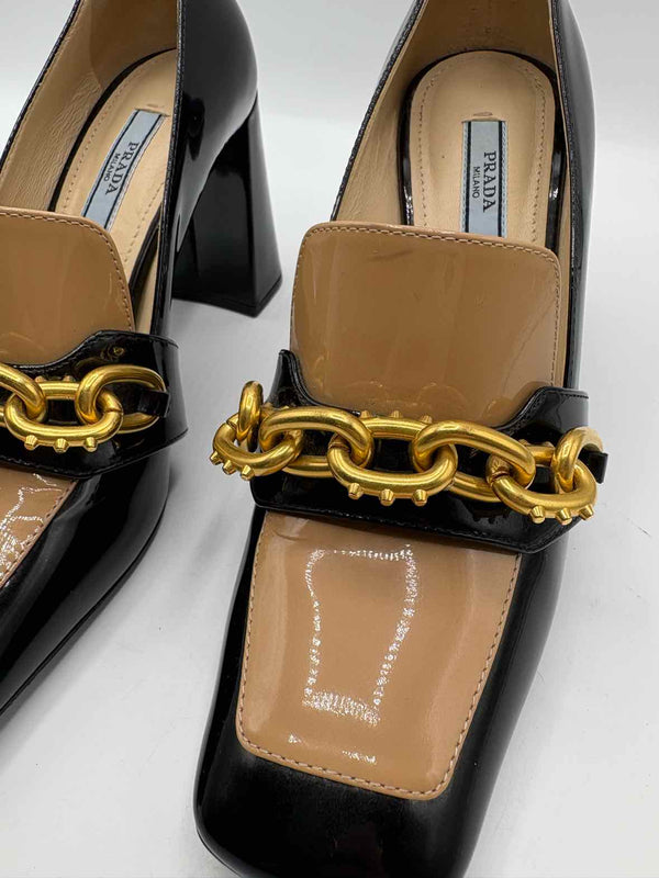 The color block design of these Prada beige and black Size 36 Shoes brings a distinctive touch to any pre-loved designer wardrobe. Crafted from patent fabric, these authentic luxury resale heels feature a squared toe and chunky block loafer silhouette, enhanced with a spiked chain across the foot for added edge. Ideal for those seeking unique women's consignment fashion, the beige and black palette offers versatile styling while the Prada brand assures timeless quality. Add a polished, eye-catching piece to your collection with this notable pair, curated for modern style enthusiasts.