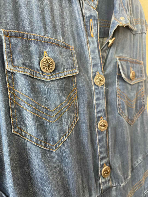 The dark denim of this Ramy Brook Denim Size S/P Dress brings a polished twist to authentic luxury resale. Chic silver floral and black rhinestone buttons, button-down closure, and semi-pleated mini silhouette showcase refined details while practical front insert and flap-over bust pockets add function. Carefully sourced for women’s consignment fashion, this pre-loved designer piece features a collared, sleeveless cut and back elastic stretch at the waist, blending comfort and style. Whether you’re refreshing your wardrobe or searching for a unique addition from a trusted brand, this dress reflects both elevated craftsmanship and the appeal of modern designer denim.