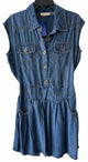 sleeveless,collared,dark denim mini semi pleated dress,silver floral,black rhinestone buttons,button down closure,bust flap over,button closure pockets,front insert pockets,back elastic stretch at waist
