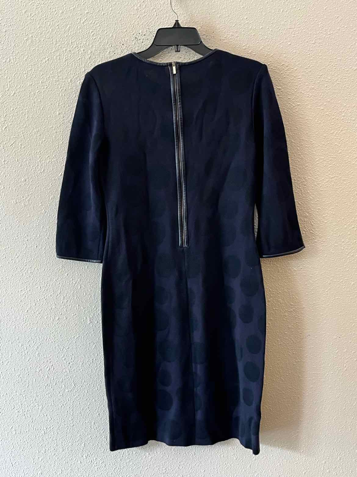 Crafted from luxurious wool and leather, this st john Navy and Black Size 6 Dress combines classic tailoring with modern flair. The polka dot jacquard knit introduces a playful element, while the leather contrast trim at the hem adds a distinctive designer touch. Ideal for those seeking authentic luxury resale and pre-loved designer pieces, this women’s consignment fashion find features a quarter sleeve silhouette, crew neck, and knee-length cut. With a back zip closure and a condition rated as very good, this dress offers refined style and exceptional value for your curated wardrobe.
