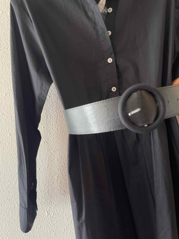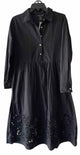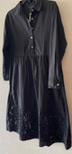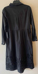 NWT,long sleeve,collared,quarter button down,solid black fit and flare midi dress,removeable adjustable belt,filigree crochet eyelet embroidered bottom,button cuff sleeves
