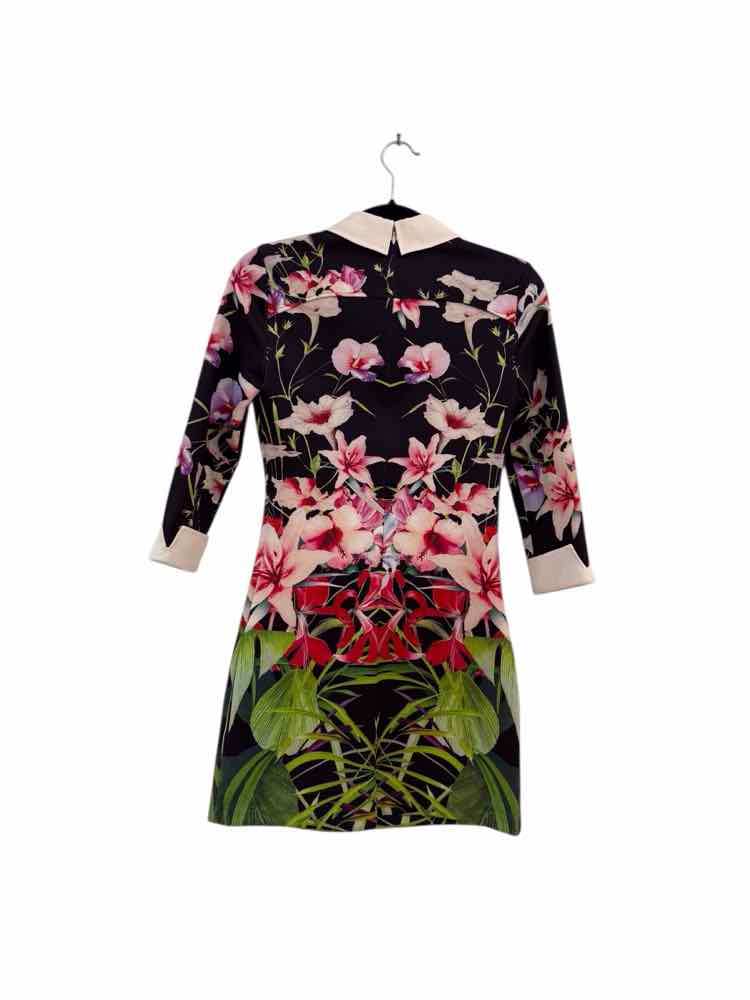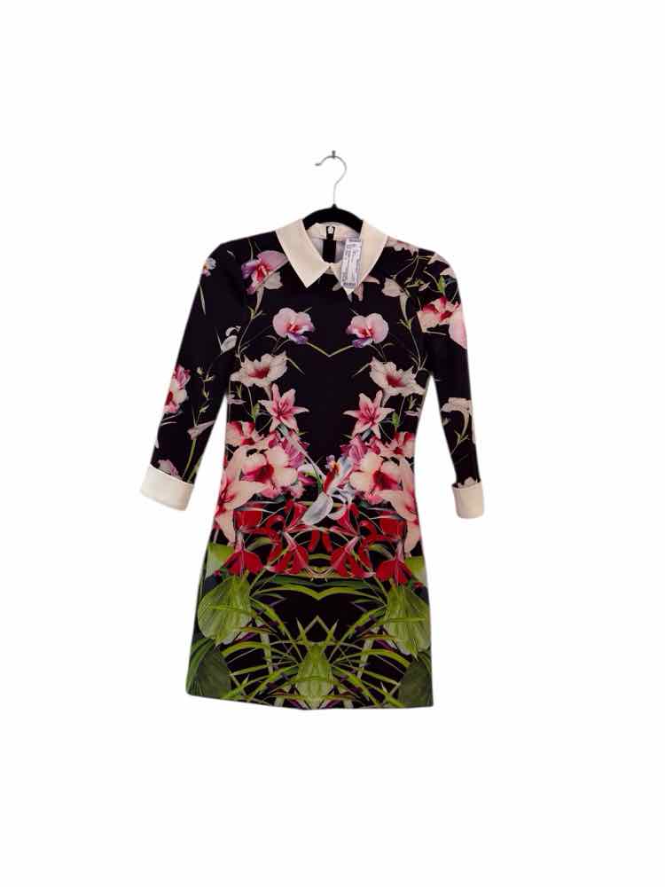 The color and pattern of this Ted Baker Multi Size 0 Dress bring a lively energy to any women’s consignment fashion collection. Multi-color floral designs bloom across a chic black base, while crisp white accents at the collar and sleeves deliver a refined contrast. With its mini length and midi sleeves, this pre-loved designer dress offers a refreshing and distinctive take on authentic luxury resale. Presented in very good condition, it’s a notable choice for those who appreciate both style and quality in their wardrobe. Discover the unique flair that comes from carefully curated designer pieces.