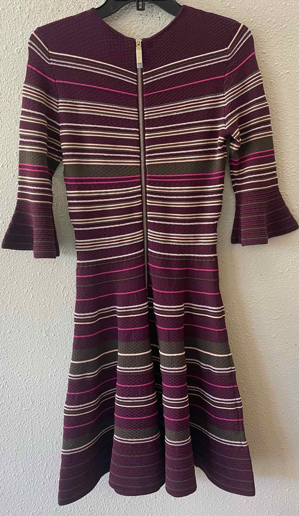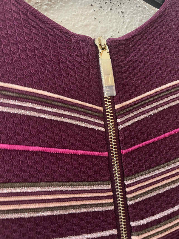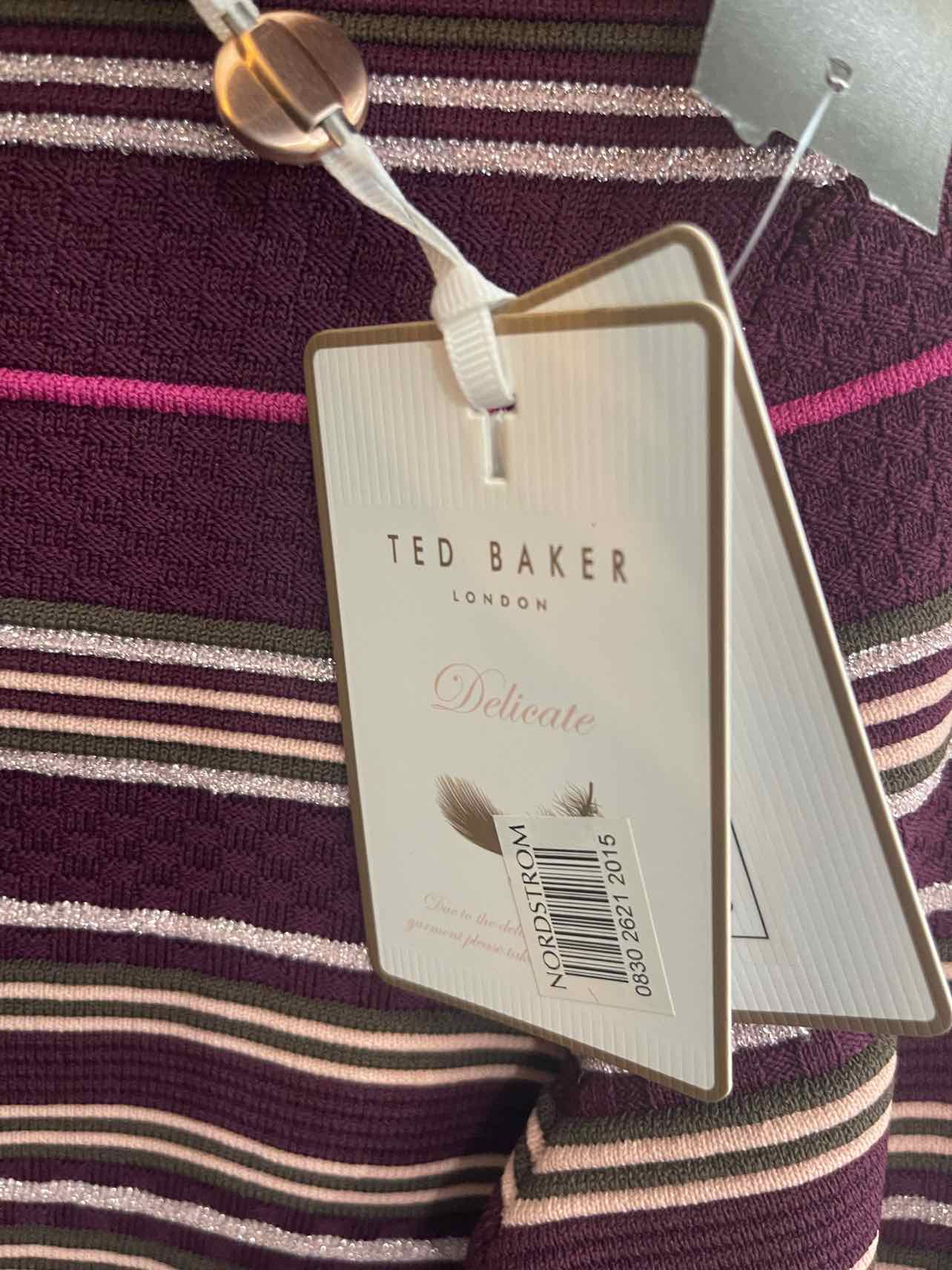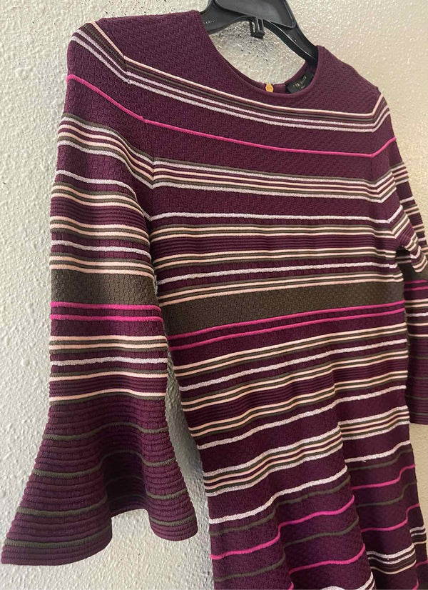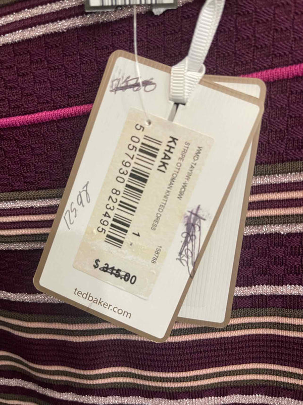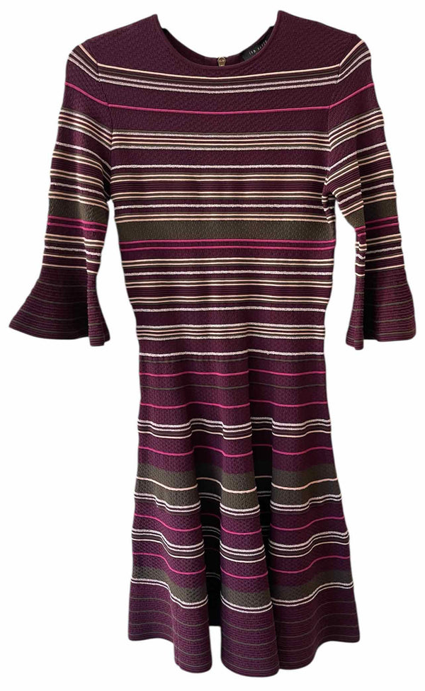 Crafted from a shimmering lurex blend, the Ted Baker Plum multi Size 1 Dress is a beautiful example of pre-loved designer fashion available through authentic luxury resale. Its Ottoman stripe knit creates a refined texture, while the quarter sleeves, crew neck, and bell cuff details provide a touch of elegance to your women's consignment fashion wardrobe. The fit and flare hem and below-knee length enhance its tailored silhouette, and a back exposed zip closure brings a modern finish. Discover unique style and quality with this new-with-tags piece, carefully curated for discerning shoppers seeking something truly special.