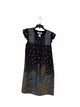 mini length, short sleeves, slight ruffles on sleeves, black bedazzled emebllishments buttons in front, flower designs