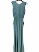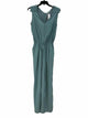 sleeveless turquoise jumpsuit, draw string waistband with ties in center, shoulder pads, pockets, wide leg fit, buttons in the back at neck